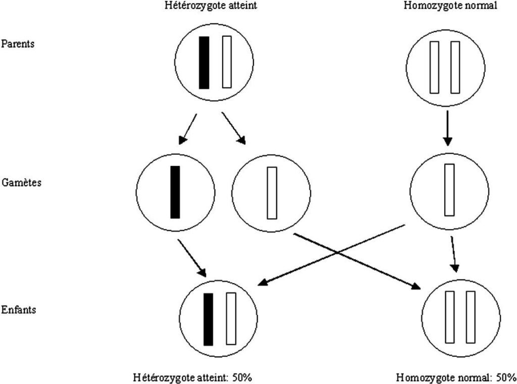 Tout sujet porteur d’un allèle morbide a un risque de 50% (1/2) de le transmettre à ses enfants quelque soit leur sexe.