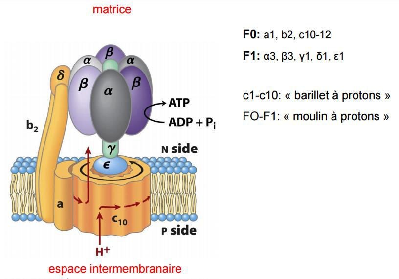 Il se crée alors une force proton motrice qui est utilisée pour la synthèse de l’ATP : En effet, il y’a dissipation du gradient de protons par la sous unité F0 (les protons retournent de l’espace transmembranaire à la matrice mitochondriale par ce canal) couplée à la phosphorylation de l’ADP et Pi en ATP par la sous unité F1.