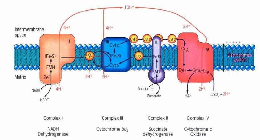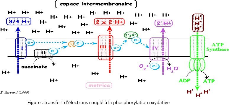 Ce flux d’électrons du cyt c à l’O2 entraine un mouvement de 2 protons de la matrice vers l’espace intermembranaire.