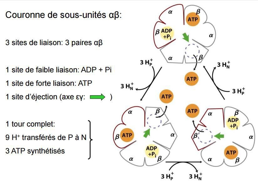 Ce flux provoque la rotation de F0 (due à la neutralisation par les protons des charges négatives portées par la protéine), ce qui entraîne des changements de conformation des sous unités de F1 ;