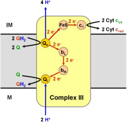 Il reçoit les équivalents réducteurs du coenzyme QH2 et les passe au cytochrome c via les cytochromes b et la protéine Fer-soufre.