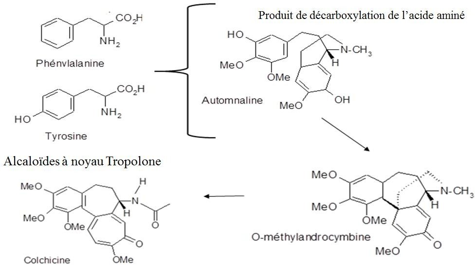 Le précurseur de ces alcaloïdes est la phénylalanine et la tyrosine est précurseur du noyau tropolon.