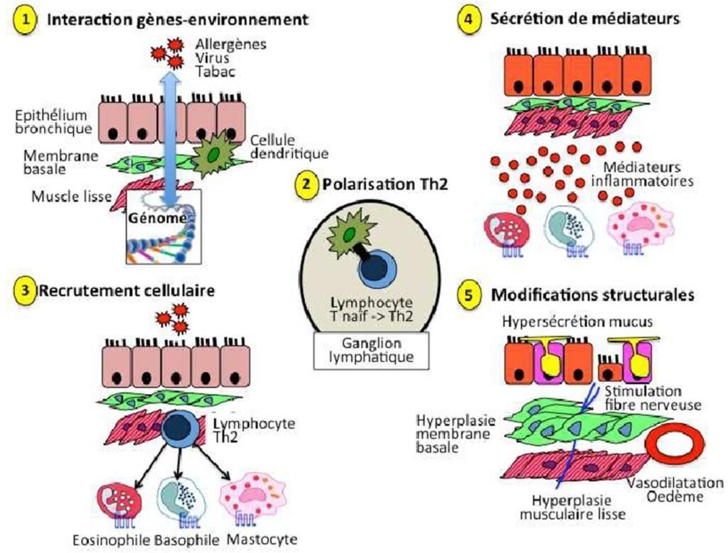 L’asthme est une atteinte inflammatoire chronique des bronches impliquant plusieurs types de cellules dont les éosinophiles, mastocytes, lymphocytes, macrophages et les cellules épithéliales.