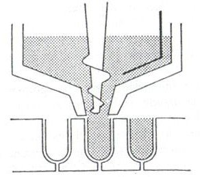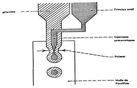 la mise en capsule se fait selon deux procédés : procédé par injection et soudure simultanées (figure 1), procédé à la goute (figure 2).