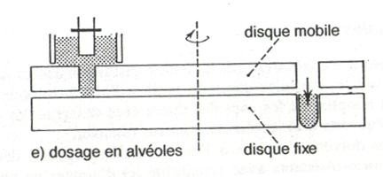 Le dosage de la poudre peut se faire par arasage et bourrage dans les alvéoles d’un disque qui, en tournant, vient déverser leur contenu dans les demi-capsules.