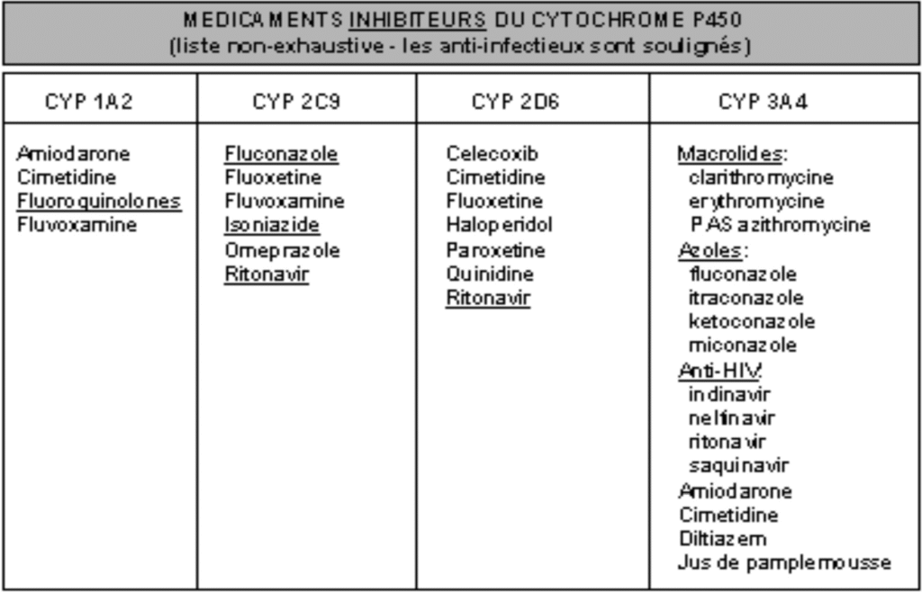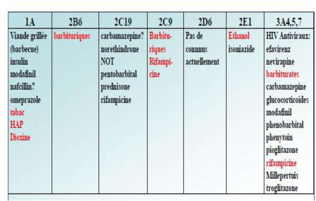 – CYP 3A4, CYP 2D6, CYP 2C9, 2C19 et CYP 1A2