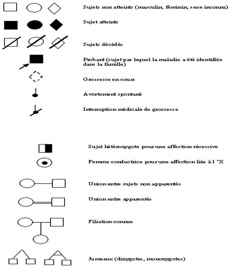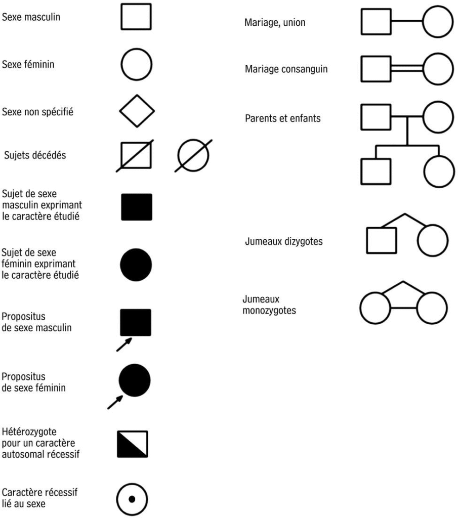 En généalogie humaine, les observations peuvent être retracées sur un seul schéma portant différents symboles (Fig. 1).