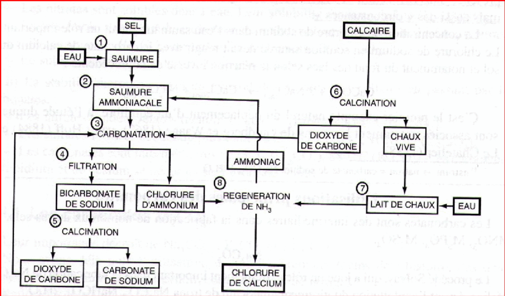 L’hydrogénocarbonate d’ammonium dissous formé [NH4)+,(HCO3)–] réagit dans la saumure saturée en NaCl avec précipitation de NHCO3