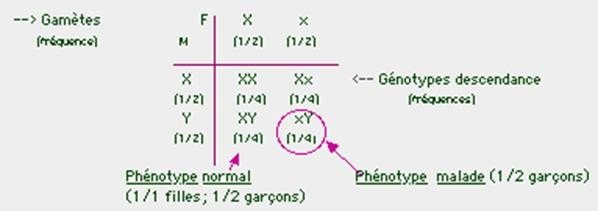 Cas le plus fréquent : Femme hétérozygote, donc bien portante et conductrice, épousant un homme normal
