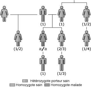 Probabilité pour les différents apparentés d’un malade (a/a) d’être porteur sain d’un de ses deux allèles mutés (hétérozygote A/a). est :