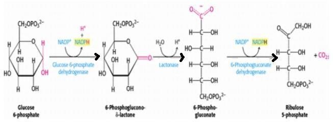 Catalysée par : la glucose -6- phosphate déshydrogénase (G6PD) => enzyme clé.