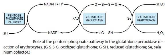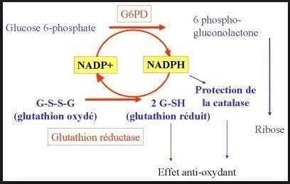Le glutathion réduit par NADPH,H+ protège le globule rouge des dommages causés par des molécules oxydantes (stress oxydatif).
