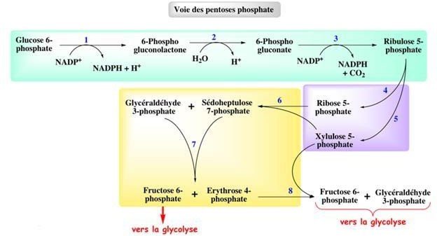 Voie des pentoses phosphates, shunt des hexoses monophosphate, voie du 6- phosphogluconate, ou voie de Dickens-Horecker.