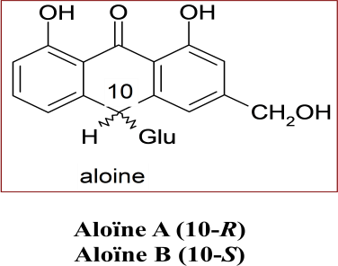 Le suc: 15 à 40% d’anthracénosides : Aloïne (=Barbaloine), hydroxy-aloïne, aloïnoside (chez A.ferox)