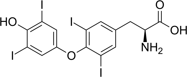 | V3. IODE : l’iode est un élément essentiel trace dans l’organisme qui représente 2 x 10-5% de la masse corporel. Il est principalement présent dans les hormones thyroïdiennes.Rôle biologique :L’iode est essentiel au fonctionnement de la glande thyroïde (hormones thyroïdiennes). Sa carence conduit, entre autres, à l’hypertrophie de la thyroïde (goitre).Dans ces hormones, la liaison C-I est apolaire (χI – χC ≈ 0.2) et est comparable à la liaison C-H (χC – χH ≈ 0.3) en terme de stabilité. Cependant, la taille de I (133 pm) permet à la molécule de se fixer dans les cavités des sites actifs enzymatiques.Aspects pharmaceutiques :Agent de contraste : avec sa masse atomique élevée (Z = 53) l’iode est opaque aux rayons X. Il est utilisé comme produit de contraste, notamment dans l’exploration de l’appareil urinaire et de la thyroïde.Biocide et désinfectant (PVP/I2 : Bétadine®) : L’iode est doté d’un pouvoir biocide, il est utilisé en solution comme antiseptique (désinfection des blessures, de la peau avant une intervention chirurgicale). | |
