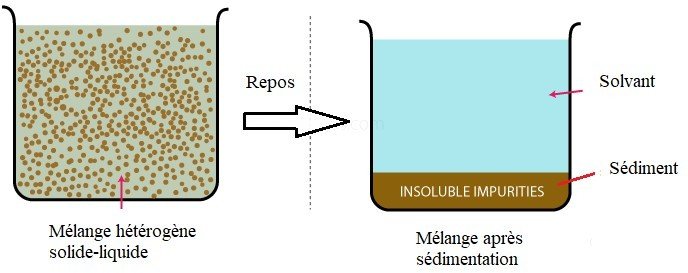C’est un procédé de séparation mécanique qui permet de séparer les constituants d’un mélange hétérogène composé de deux liquides non miscibles sous l’effet de leur densité ou un solide en suspension d’un liquide sous l’effet du poids (souvent nommé sédimentation).