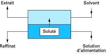 La solution à extraire circule en sens inverse du solvant extractif dans une tour d’extraction.