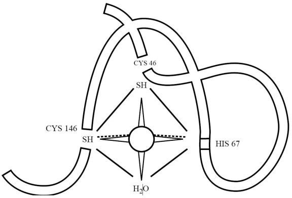 Le zinc réalise quatre liaisons rigides ayant la forme d’une pyramide tétraédrale avec deux molécules de cystéine, une molécule d’histidine de la chaîne protéique et une molécule d’eau.