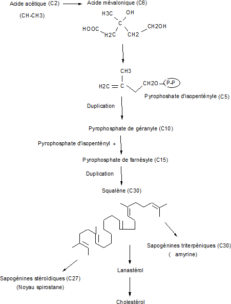 Acétate → mévalonate → géranylphosphate → farnésylphosphate → squalène → stéroïdes ou triterpénoïdes.