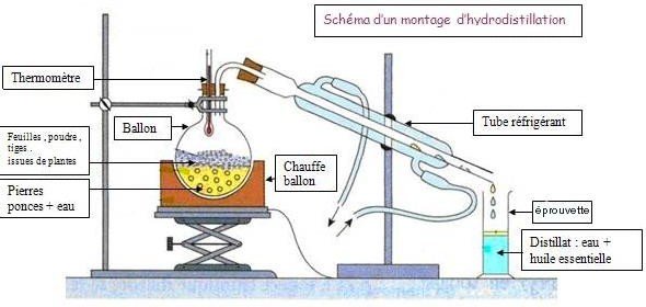 Principe : Le matériel végétal (intacte ou broyé) est immergé dans un ballon rempli d’eau qui est porté à ébullition, les vapeurs hétérogènes produites (H2O+HE) sont condensées sur une surface froide et l’HE se sépare de la phase aqueuse par différence de densité.
