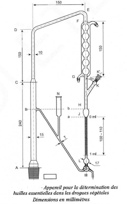 Le distillat est recueilli dans le tube gradué en présence de xylène pour fixer l’huile essentielle tandis que la fraction aqueuse retourne automatiquement dans le ballon générateur de vapeur, le Résultat est exprimé en ml/kg de drogue.