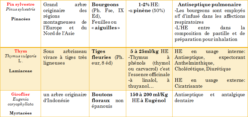 Les teneurs en HE sont faible souvent < à 10ml/kg, exceptionnellement le giroflier à 150ml/kg.