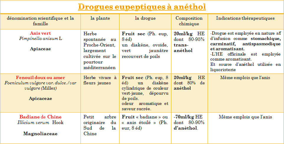 Parmi les constituants très nombreux des huiles essentielles l’un domine généralement : HE de badiane et d’anis renferment 95% d’anéthole.