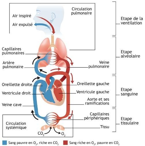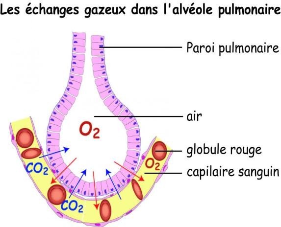 Le poumon remplit cette double mission en ventilant les alvéoles avec de l’air extérieur, qui est ainsi mis en contact avec le sang veineux.