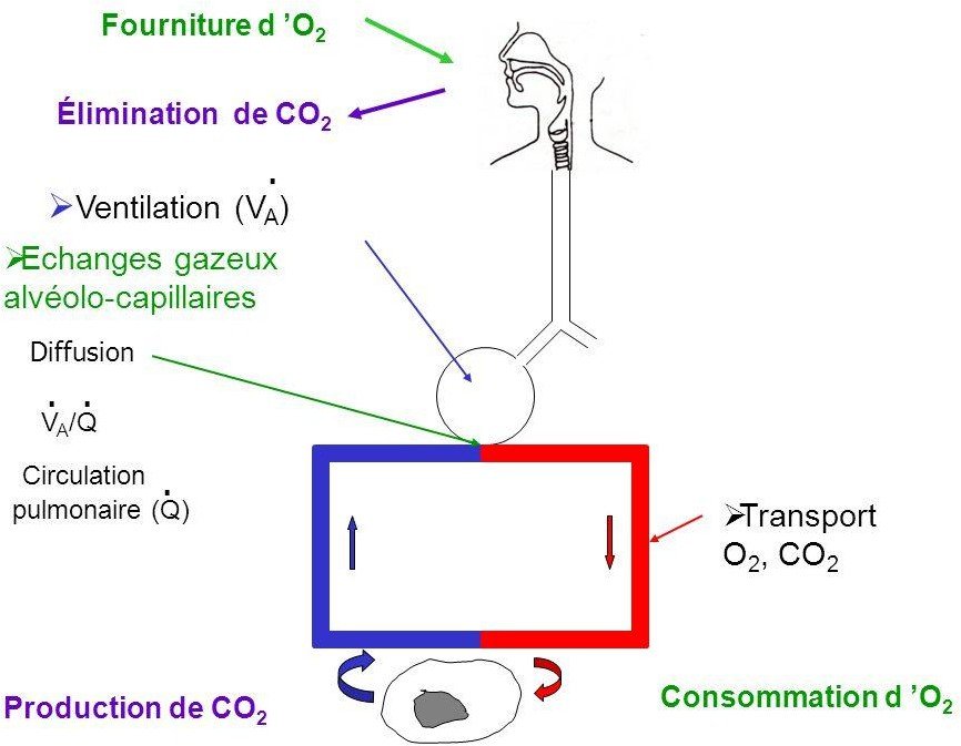 Il en résulte une inadéquation entre les besoins métaboliques et les apports en oxygène ce qui aboutit à une hypoxémie et éventuellement à une hypercapnie.