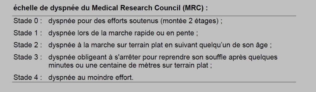 Apprécier la dyspnée dans le cadre des activités quotidiennes du patient, en précisant les activités que le patient est capable de réaliser et celles qui doivent être interrompues du fait de la dyspnée (Nombre d’étages, périmètre de marche, activités de vie quotidiennes).