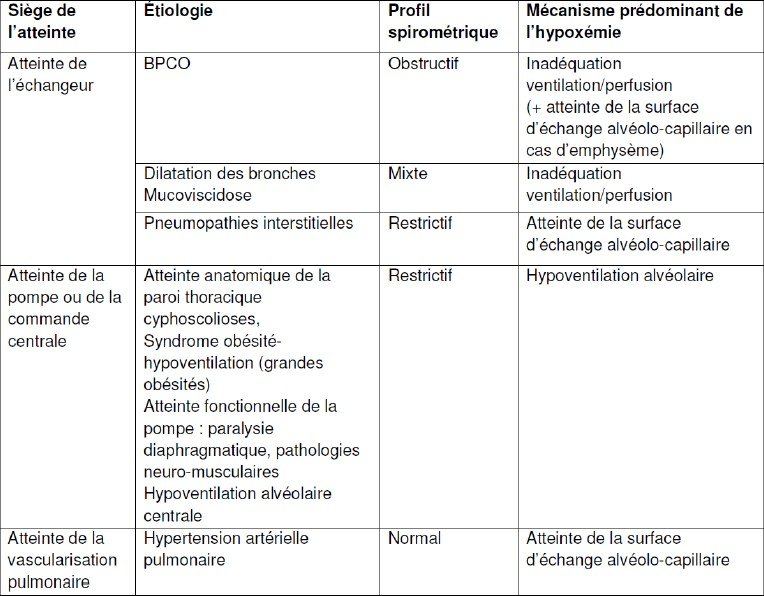 L’insuffisance respiratoire peut être causée par une hypoventilation des alvéoles, des anomalies du rapport entre la ventilation et la perfusion des unités pulmonaires, des shunts sanguins droit- gauche, une diminution de la pression partielle inspirée d’oxygène, et éventuellement des troubles de la diffusion des gaz.