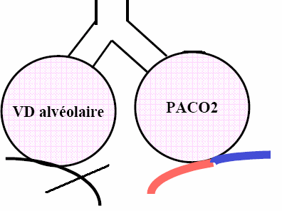 Effet espace mort: Zones pulmonaires qui sont normalement ventilées mais pas ou peu perfusées (hypovolémie, insuffisance cardiaque, troubles de la circulation pulmonaire).