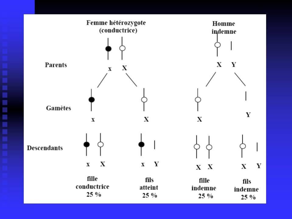 -Les femmes hétérozygotes ne sont pas atteintes mais peuvent transmettre la maladie ; elles sont dites conductrices