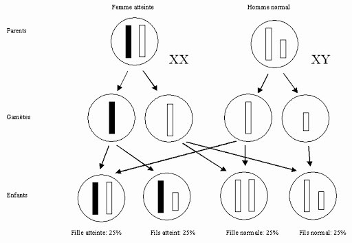 Si un homme atteint se reproduit, aucun de ses enfants n’est malade, mais toutes ses filles sont conductrices.