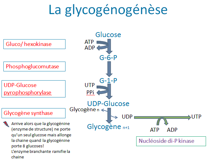 La glycogène synthase qui assure la formation de la liaison (1-4) est une enzyme d’élongation et ne peut initier de novo la synthèse du glycogène à partir du glucose.