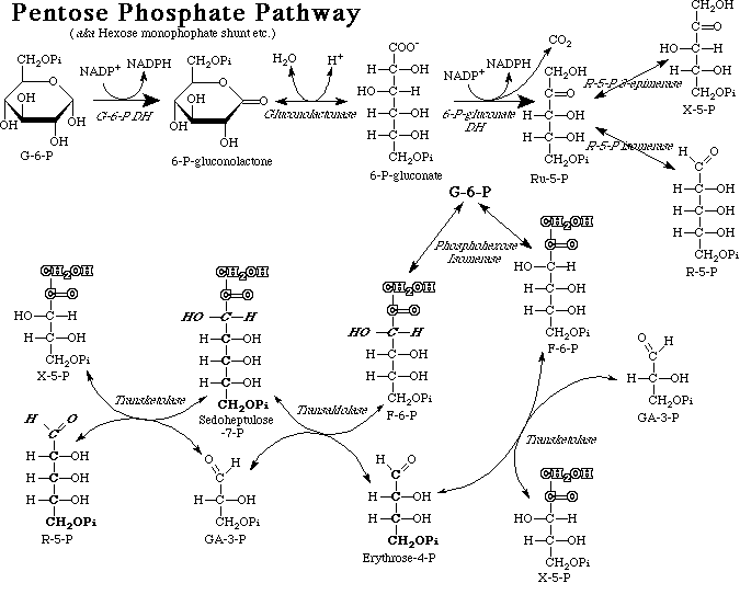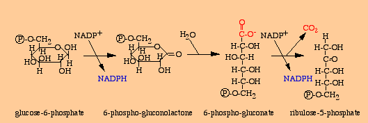 Dans les érythrocytes, le déficit d’équivalents réducteurs (NADPH,H+) entraîne une diminution de la formation de glutathion réduit, qui protège les érythrocytes des agents oxydants.
