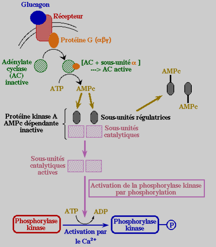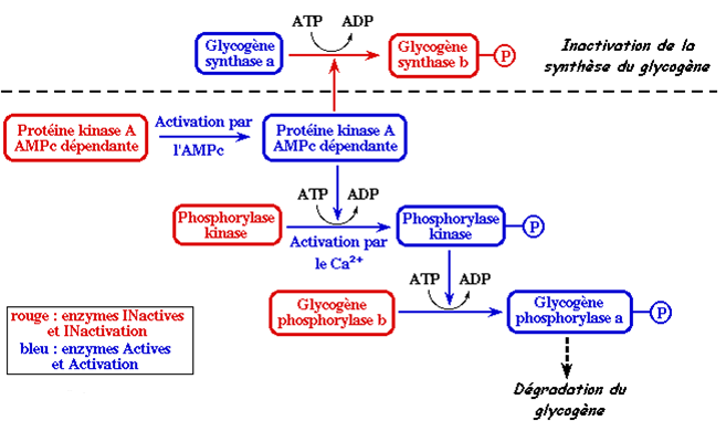 En effet, les catécholamines (adrénaline) au niveau des muscles et le glucagon au niveau du foie entraînent l’activation de protéines kinases qui auront deux fonctions différentes mais complémentaires :