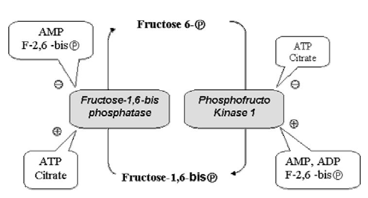 | Dans le foie, le F2,6BP est un inhibiteur de la fructose-1,6-bisphosphatase, une enzyme de la néoglucogénèse.Le citrate est un inhibiteur de la PFK-2 : il y a moins de F2,6BP synthétisé. Or ce dernier étant un activateur de la PFK-1, cela amplifie l’effet inhibiteur de la PFK-1 par le citrate. |