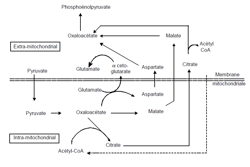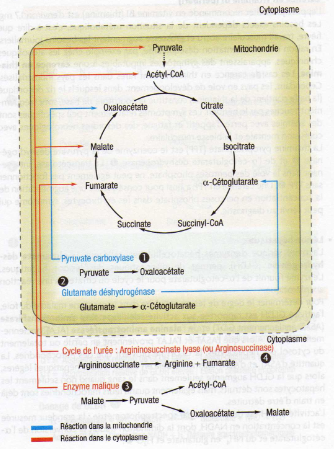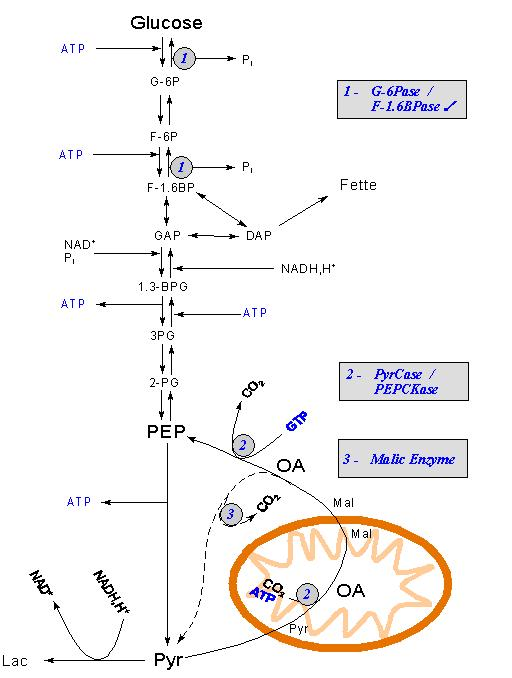 Cette enzyme est inhibée par le pyruvate, l’alanine, l’ATP et le NADH,H+, citrate, AMPc, glucagon.