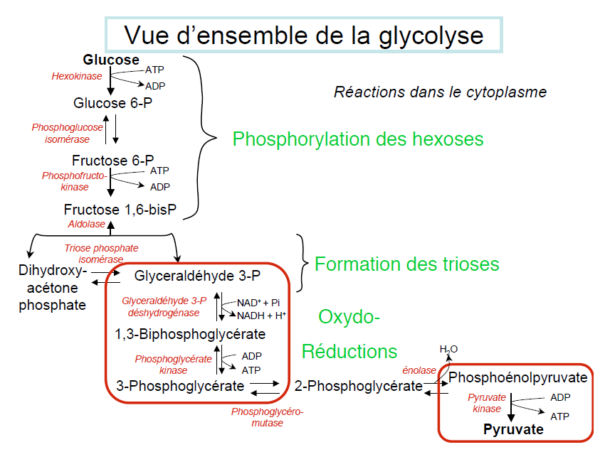 Il est à noter que tous les intermédiaires entre le glucose et le pyruvate sont phosphorylés ce qui leur confère une charge négative nette à pH 7, les empêchant ainsi de diffuser à l’extérieur de la cellule.
