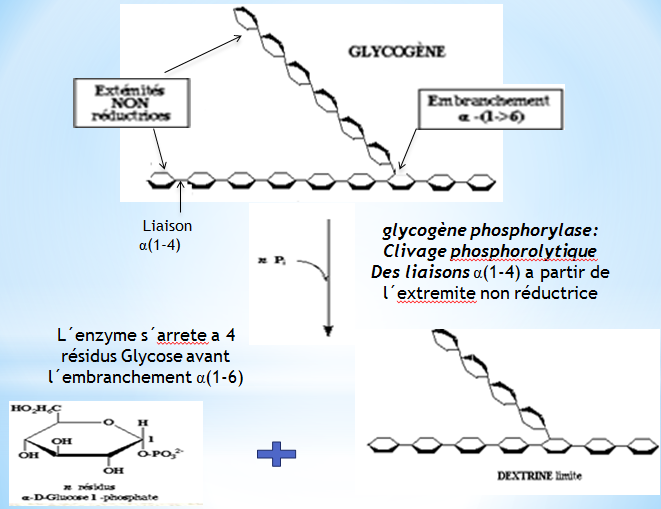 Après l’action de ces trois enzymes le glycogène libère essentiellement du glucose 1- (par phosphorolyse) et une faible quantité de glucose (hydrolyse).