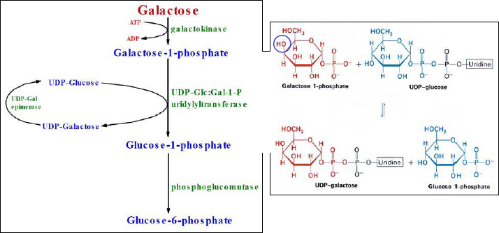Elle est en général déclenchée par un déficit en galactose -1-phosphate uridyl transférase et est diagnostiquée par une augmentation de l’élimination de galactose dans les urines.