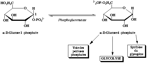 Le glucose1-est isomérisé en glucose-6-par la phosphoglucomutase.