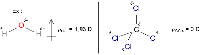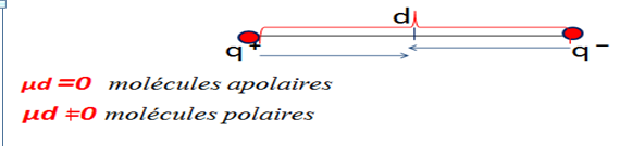 Une molécule possède un moment dipolaire non nul lorsque le barycentre des charges positives (q+) n’est pas confondu avec celui des charges négatives (q-).